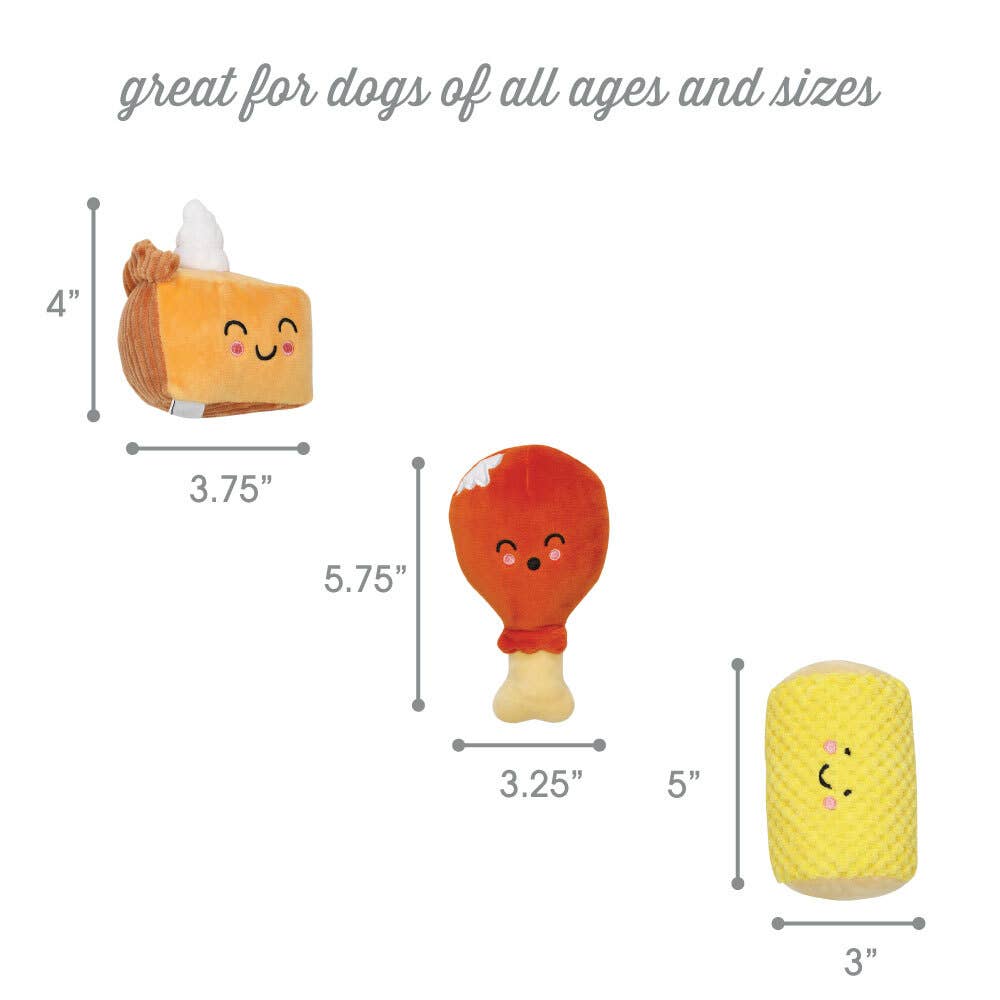 Includes three plush squeaky Thanksgiving meal toys that are dog tested and dog approved; perfect for small dogs, medium dogs and large logs of any age and any breed.